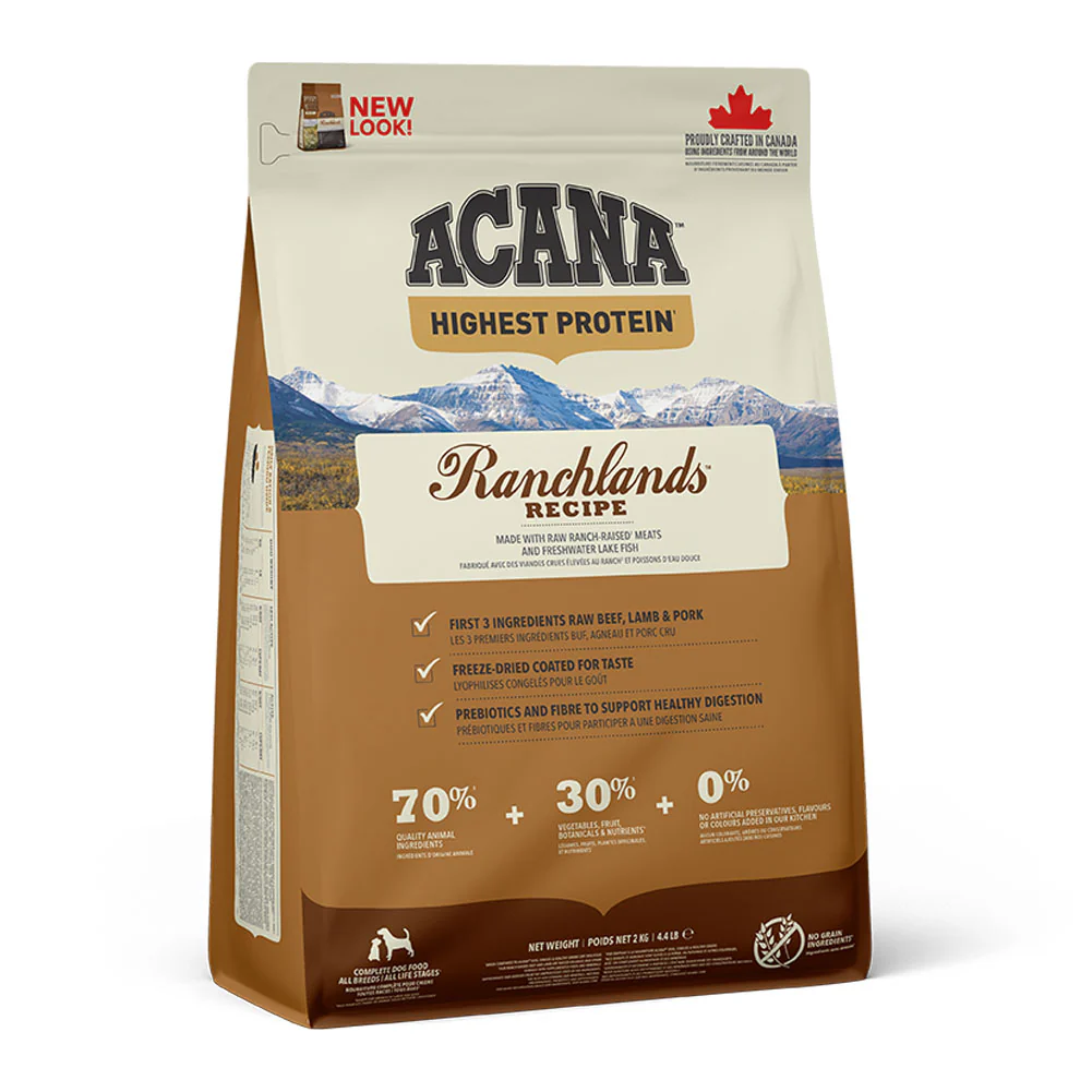 Every ACANA recipe is thoughtfully crafted from start to finish with premium ingredients. With the highest protein offering in ACANA pet foods, our ACANA Highest Protein Ranchlands Recipe is rich with 70%* quality animal ingredients like ranch-raised**** beef, pork, lamb, freshwater lake fish and bison, balanced with 30%** fruits, vegetables, and botanicals, delivered daily. Artificial colours, flavours or preservatives are never added in our kitchen.
