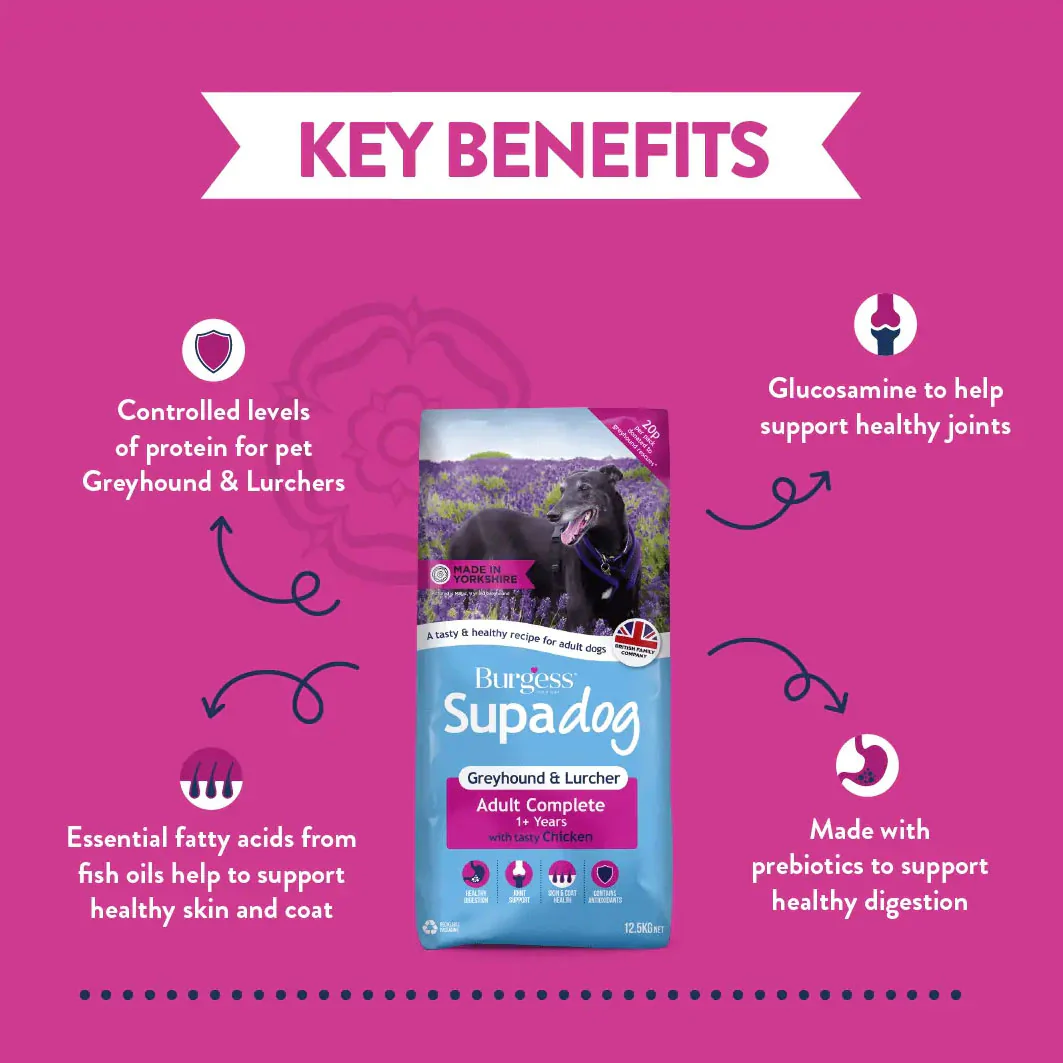 This Burgess Greyhound & Lurcher Adult Dry Dog Food recipe contains highly digestible ingredients for healthy digestion, and glucosamine to support joint health. Whilst itās suitable for all dog breeds, this recipe is specially formulated to support the requirements of greyhound and lurchers. Plus, for every sack purchased Burgess donates 20p to greyhound and lurcher rescue charities in the form of free food.