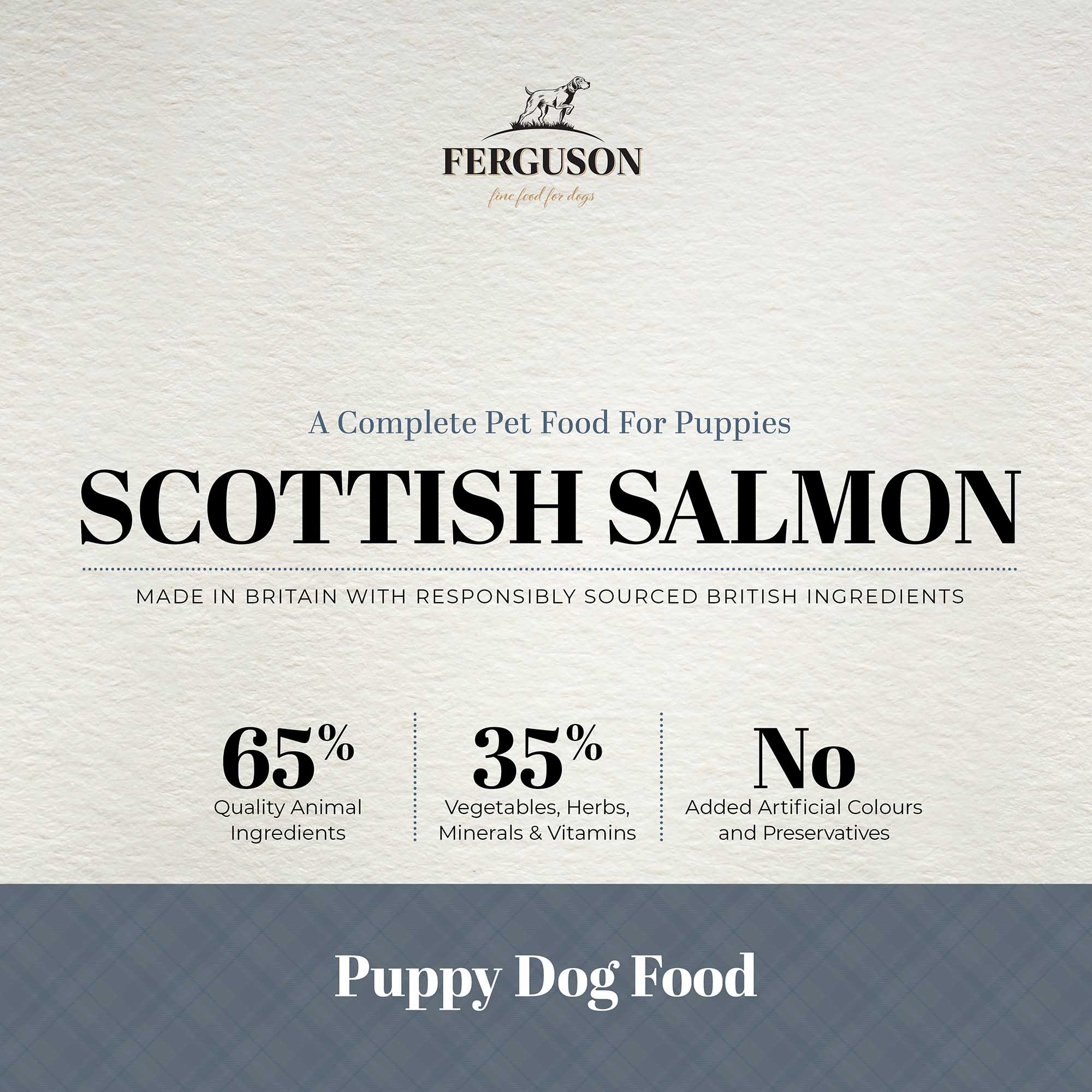 You can feel good about feeding your dog Ferguson Scottish Salmon Puppy Dry Dog Food, because it's made with the same thought and care that you would put into your own food.